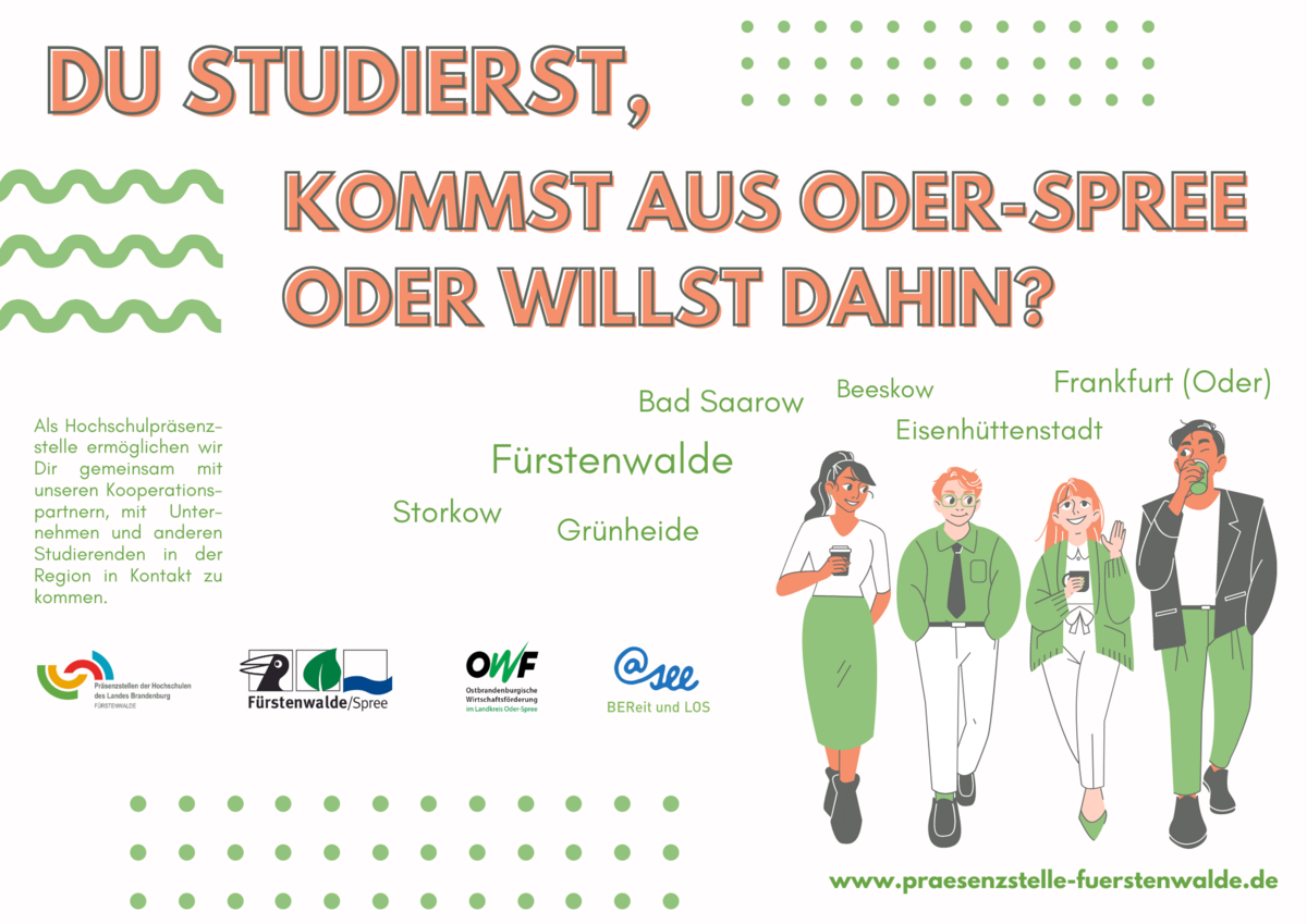 Die Präsenzstelle Fürstenwalde ist eine Kooperation der Europa-Universität Viadrina Frankfurt (Oder) und der Technischen Hochschule Wildau. Wir bieten Ihnen einen direkten und persönlichen Zugang zu allen Hochschulen und Forschungseinrichtungen des Landes Brandenburg.