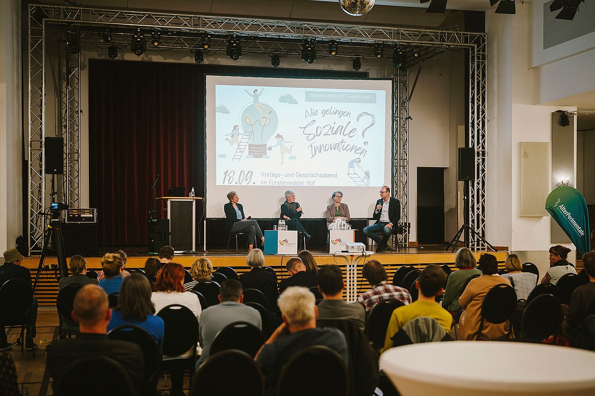 Bereits zum dritten Mal bot die Präsenzstelle mit dem Format „Wissenschaft trifft Gesellschaft“ eine Plattform für den Austausch zwischen Forschenden mit Bürgerinnen und Bürgern zu einem gesellschaftlich relevanten Thema. Nach Fake News und Künstlicher Intelligenz ging es in der Veranstaltung am 18. September um das Thema Soziale Innovationen: Gemeint sind aus der Gesellschaft heraus entwickelte Ansätze und Lösungen, die das Leben in der Region spürbar verbessern können. Aber wie innovationsfähig ist die Region überhaupt? Welche Hemmnisse und welche Chancen gibt es? Welche Ansätze werden schon erprobt und wo kann eine Zusammenarbeit mit Hochschulen sinnvoll sein? Zu diesen und weiteren Fragen tauschten sich die ca. 60 Gäste mit den Expertinnen und Experten aus Wissenschaft und Praxis aus.