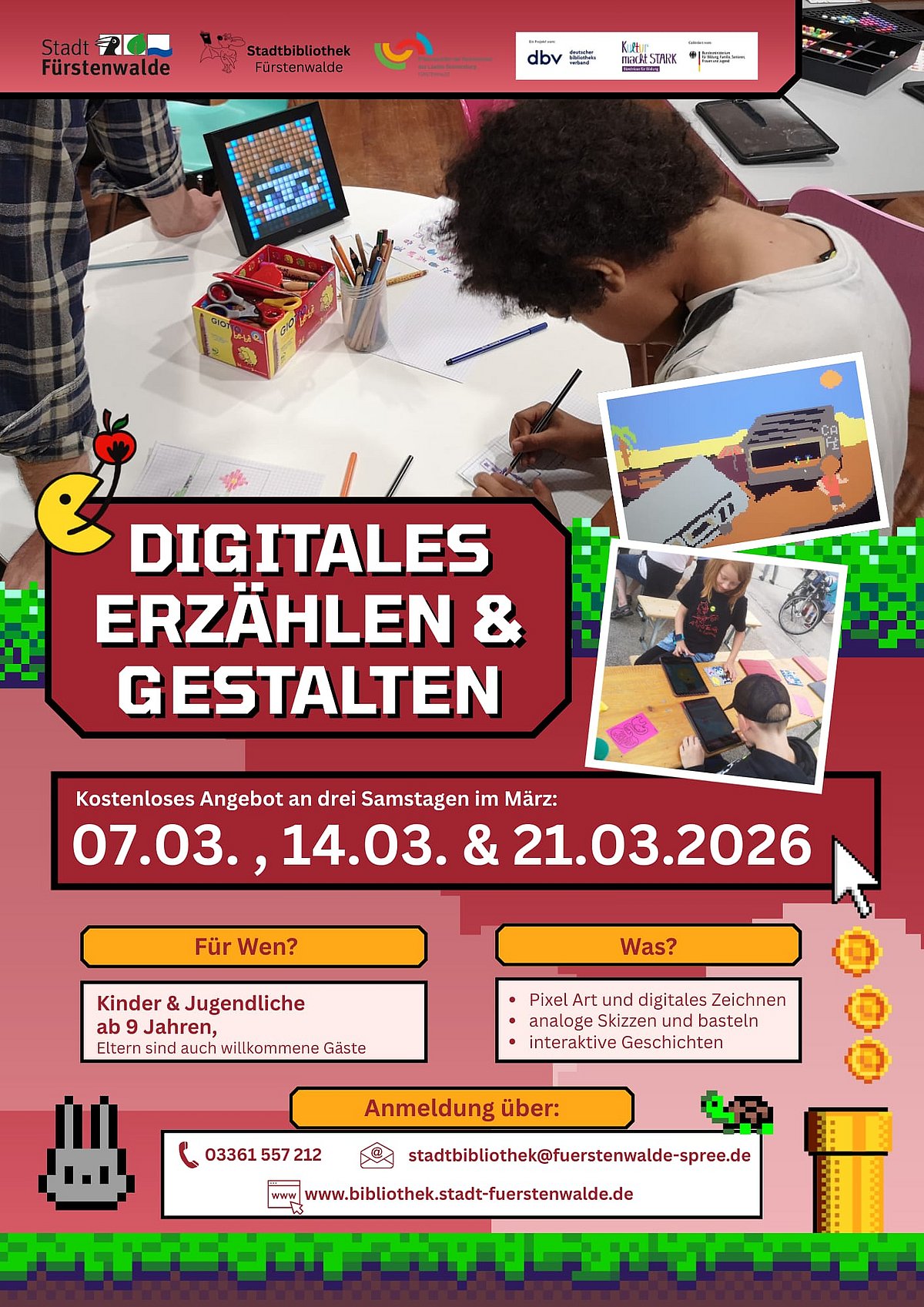 Der Workshop Digitales Erzählen & Gestalten findet dreimal am Samstag im März, in der Stadtbibliothek Fürstenwalde, Domplatz 7, 15517 Fürstenwalde/Spree statt.