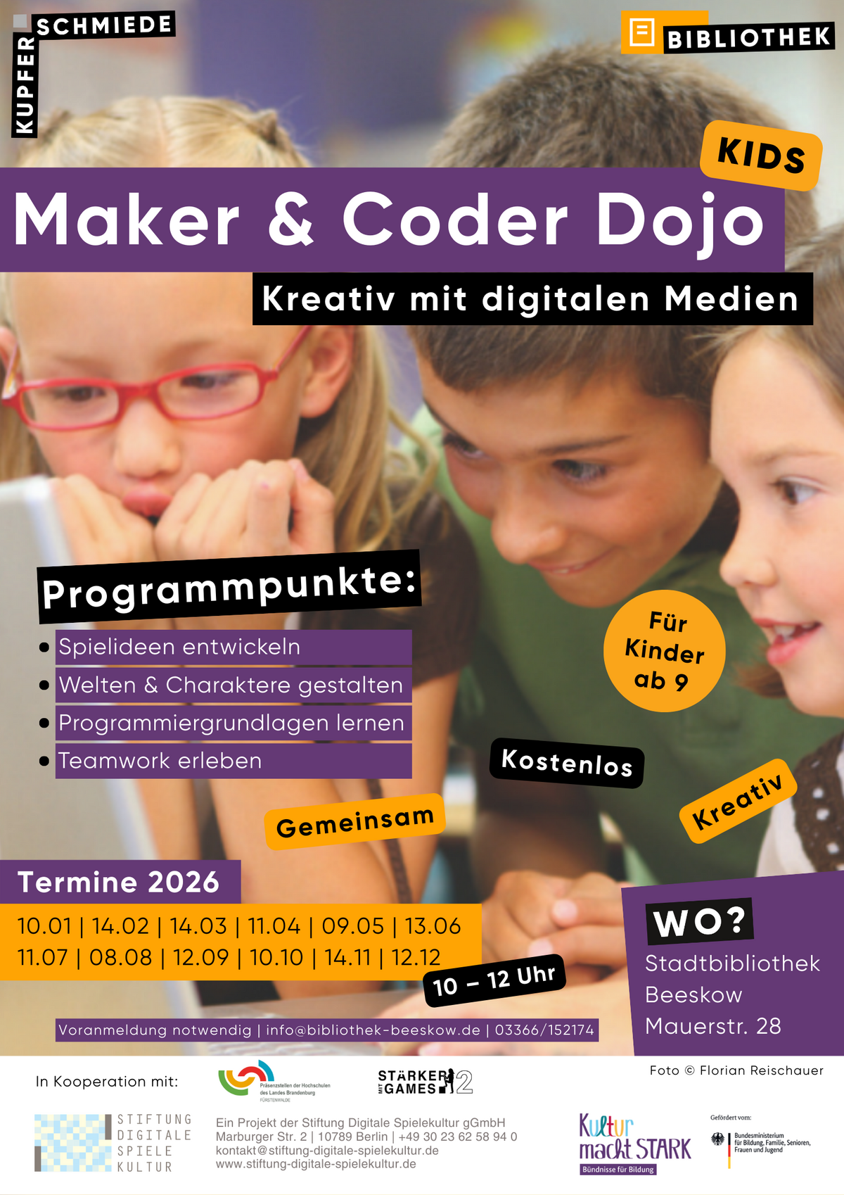 Beim Maker & Coder Dojo Kids in der Stadtbibliothek Beeskow steht das Entwerfen eigener digitaler Welten im Mittelpunkt: Die Kinder entwickeln Figuren, gestalten Spiele und lösen gemeinsam spannende Aufgaben. Das Angebot verbindet MINT-Förderung mit Kreativität, Neugier und Spaß am Ausprobieren.
