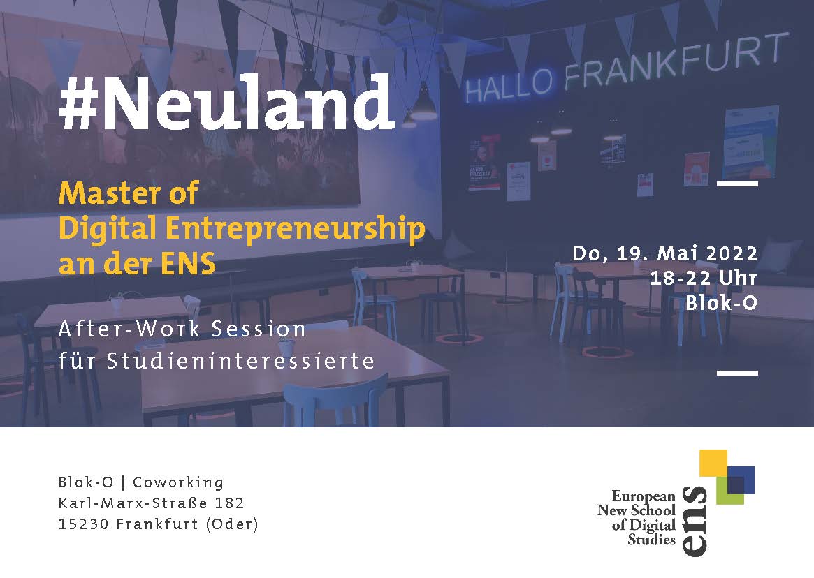Informieren Sie sich bei einer After-Work-Session am Donnerstag, den 19. Mai 2022 ab 18 Uhr im Blok-O in Frankfurt (Oder)! Die European New School lädt Studierende dazu ein, den interdisziplinären Master of Digital Entrepreneurship (MoDE) und die ENS näher kennenzulernen.