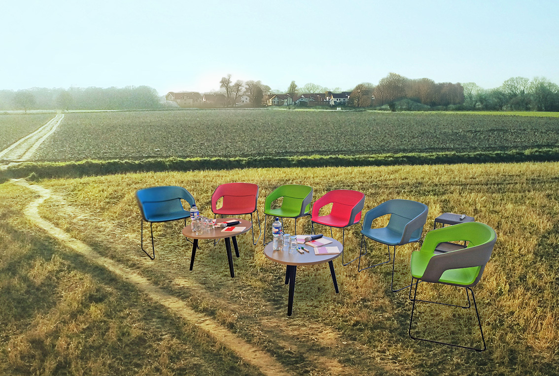 Fotomontage: Andreas Paßens/IRS, Hintergrundfoto Chris Spalton via Unsplash, Foto Stühle Ralph Richter/IRS, Dorf KI-generiert mit Midjourney